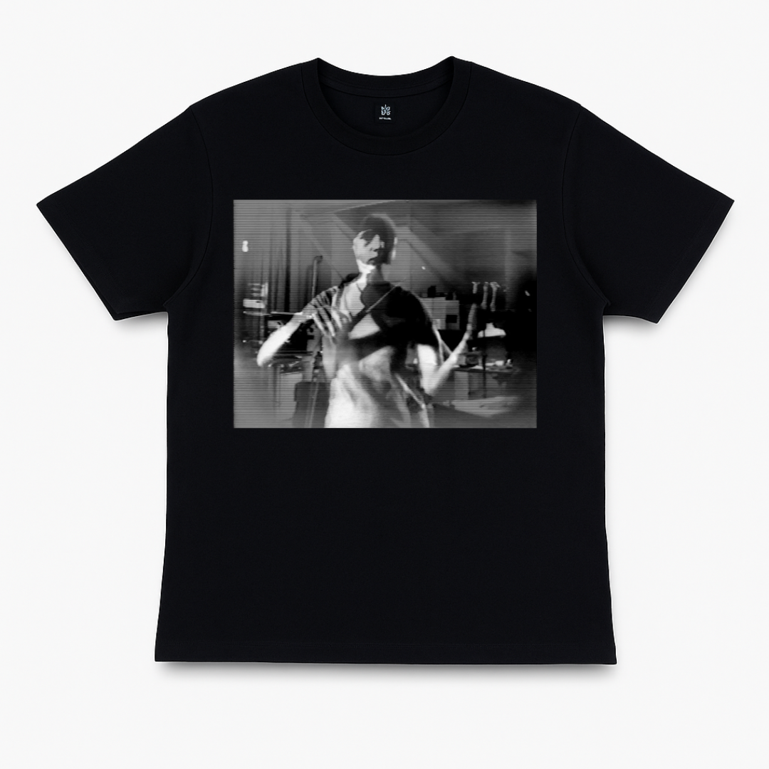 Black t-shirt with printed image from Violin Power, a work by Steina from 1978.